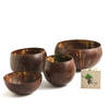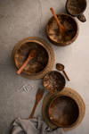 Our bowls are made from 100% natural coconut shells, they are handcrafted by artisans in Kerala. Each bowl is unique as they form naturally, natural grain of the coconut shell, texture and color variations, natural ridges, markings vary for each shell. How to care for your bowls Hand wash with soapy water. Rub coconut oil on bowl every 15 uses. Only room temperature or cold foods in a bowl, avoid hot food in the bowl. Do not refrigerate the bowl. Do not microwave bowl or put in oven Do not put in dishwasher. This comes as a set of 4. Please note the spoons are not included with the product.
