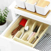 Maximize your drawer space with this cutlery organizer!. Keep all your knives and cutlery safely stored in your drawer with this handy and compact organizer. It is a smart and safe solution to an everyday problem. This design provides 5 deep compartments for holding cutlery. It includes a utensil area for knives or larger kitchen tools, 3 separate compartments for keeping spoons, forks, butter knives or spreaders, and one small compartment for teaspoons and fruit forks. This is the ideal solution for those short on kitchen drawer space as this compact organizer frees up room for all your other