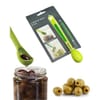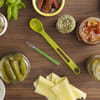 This jar spoon and fork set is specifically designed to remove pickles, olives, and other canned items. This spoon is thin and long and features holes to automatically drain the liquid content. The compact base makes it easy to scoop the olives without dropping them back. The fork can be used to remove sticky ingredients such as pickles or sundried tomatoes without dropping them. This ultimate kitchen tool kit is easy to store in your drawers. It is made of plastic and stainless steel and is easy to wash and clean and is dishwasher friendly.