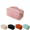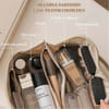 Your ultimate travel essential. Crafted from high-quality, soft PU leather fabric, it is waterproof, durable, and easy to clean. With a cleverly designed double-compartment interior, it keeps your cosmetics and brushes neatly organized. An inner pocket secures your essentials in place, preventing any unwanted shifting. Its compact layout boasts ample storage, and the bag opens flat for effortless access. This portable and lightweight bag features a sturdy handle for easy carrying.