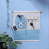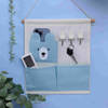 A cute organizer with a dog theme makes it even cuter!This organizer made from canvas has a scroll design with wood and chord for hanging. This organizer has 3 pouch pattern holders and 3 hooks. It makes organization easy and still looks cute and adorable with its scroll pattern and hanging. This organizer doesn't take up too much space and can be easily hung on the wall wherever needed.It comes as a single piece.