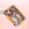 Carrying lunch is made easy with this four-grid lunch box, packing the entire meal in one single box is possible now instead of two. This sleek and durable 900 ml lunch box features multiple compartments, allowing you to pack a variety of foods without mixing up. Made from high-quality material, it ensures your meals remain fresh and safe. The spill-proof lid prevents leaks, making it perfect for carrying soups, salads, and sauces. The steel tray is removable, which makes it easier to clean the lunch box, ideal for kids and adults. It is the perfect gift for family and friends.